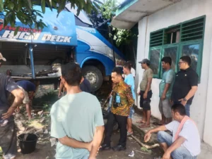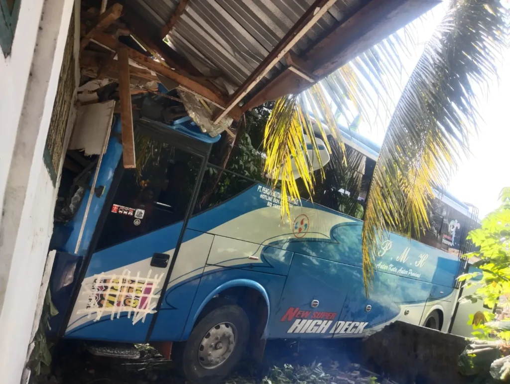 MEDIA DIALOG NEWS, Kisaran – Sebuah bus penumpang PMH dengan nomor polisi BK 7108 LD yang datang dari Pekanbaru menuju Medan menabrak bangunan Sekolah UPTD SDN 014645 di Desa Pulau Maria, Kecamatan Teluk Dalam, Kabupaten Asahan, Kamis (28/1) sekitar pukul 01.00 WIB.