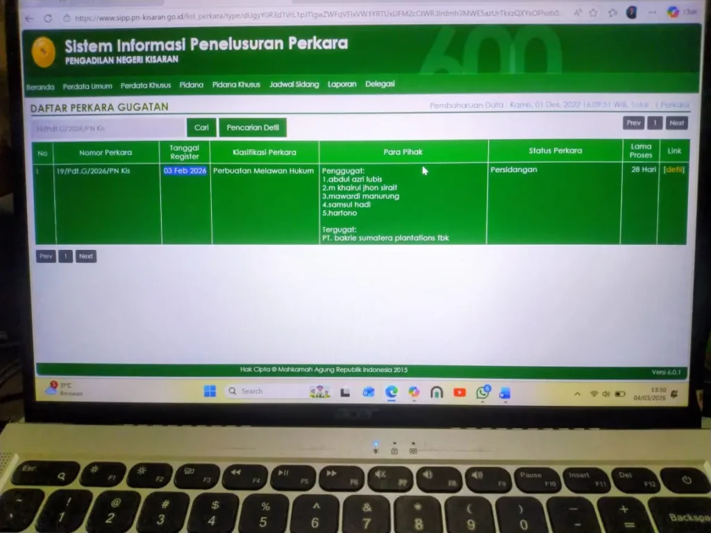 MEDIA DIALOG NEWS, Kisaran – Pengadilan Negeri Kisaran tengah menangani perkara perdata dengan nomor registrasi 19/Pdt.G/2026/PN Kis, yang didaftarkan pada 3 Februari 2026. Gugatan ini diajukan oleh lima warga Kabupaten Asahan terhadap perusahaan perkebunan besar, PT Bakrie Sumatera Plantations Tbk, terkait penguasaan lahan Hak Guna Usaha (HGU) yang masa berlakunya telah berakhir.